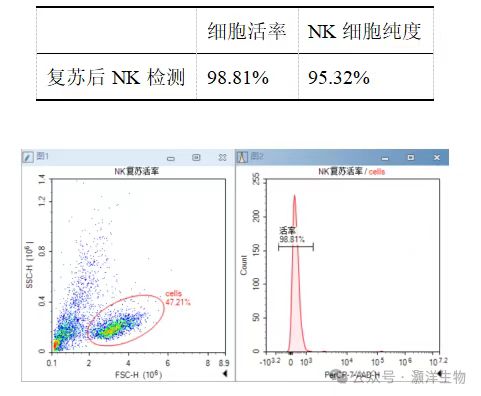 NK细胞冻存复苏后仍有很高的活率(98.8%)及很高的纯度(95.3%)
