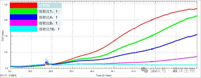 可以看到,对照组癌细胞继续稳步增殖,于90h左右到达平台期;效靶比1:1、4:1杀伤后癌细胞仍可增殖,杀伤效果不佳;效靶比为16:1时,癌细胞几乎全部被杀死,将近70h+细胞无任何增殖。