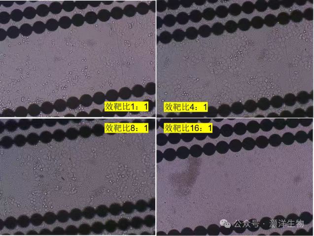 通过镜下观察图像可以看到,效靶比1:1组可看到细胞比较满,效靶比4:1组细胞呈斑块状,一些区域完全没有细胞。效靶比8:1组细胞细胞更少一些,只有少数区域长了细胞,大部分区域没有细胞生长;而效靶比16:1组几乎找不到癌细胞生长,可看到NK细胞结团。